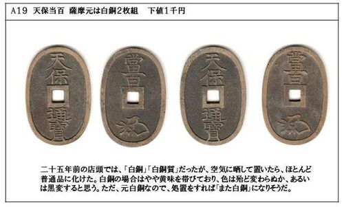 ◎古貨幣迷宮事件簿 「四月盆回し出品の解説」(続) 予め記すが、朝の出がけに記すので一層書き殴りになる。ご了承を。 A19 元は白銅の薩摩天保 二十五年から三十年前にコイン店頭に出ていた時には、「真っ白」と「ほとんど白い」という風貌だったが、放置し…